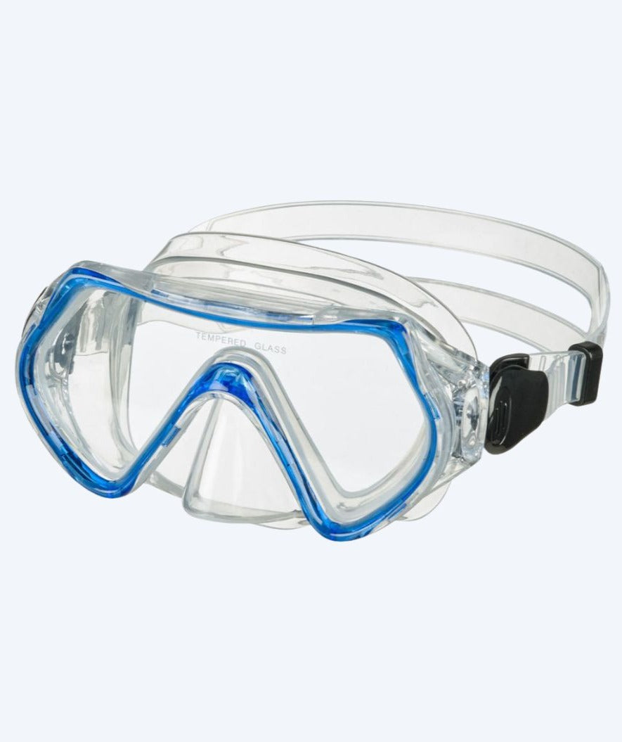 Eine äußerst komfortable Taucherbrille mit Dichtung und Nackenband aus weichem und superelastischem Silikon. Doppeltes Nackenband aus weichem Silikon und mit Seitenschnalle, die es einfach macht, die Länge des Bands anzupassen. Linse aus gehärtetem Glas, das kratzfester ist als Kunststoff.