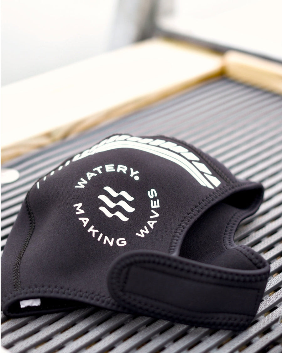 Das Thermal Neoprene Set ist grötenteils schwarz und mit silbernen reflektierenden Details kombiniert sowie mit einem Watery Logo auf jedem Teil.